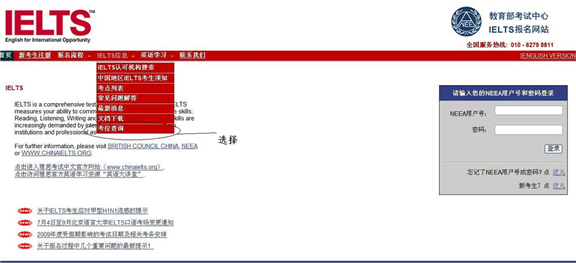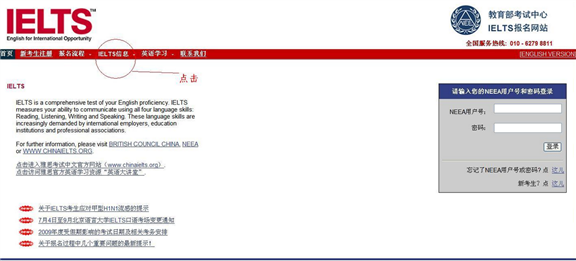 第二步:在导航栏中有新考生注册,报名流程,IELTS信息,英语学习,联系我们选项。选择IELTS信息 点击。