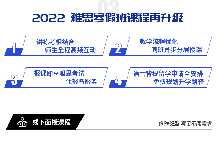 | 雅思1V1A计划 | 雅思模考成绩5分(含)以上学员 | 1.学习时间、地点无法固定; 2.曾多次参加考试,分数变化不大,急需打破瓶颈; 3.基础薄弱,没有合适的小班课程,希望短期改善雅思水平; 4.已被录取,迫切需要语言成绩或想节省时间的学员 |